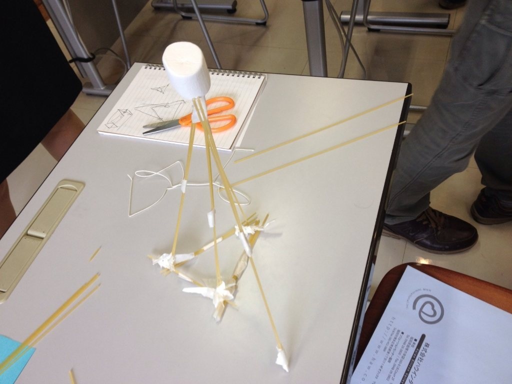 会場へ入ると所々にあるマシュマロと封筒、そして数字の書いてある紙・・・。えっ!まじでマシュマロ!?と思ったのは自分だけではないはずです。このマシュマロ・チャレンジ、チームに分かれて行う演習でした!今回実際に行い作った物がこちら!